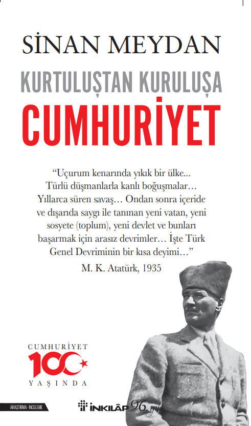 Tarihçi Yazar Sinan Meydan, 100 yaşına ulaşan Cumhuriyet’in hangi şartlarda var edildiğini anlattığı kitabı “Kurtuluştan Kuruluşa Cumhuriyet”, İnkılâp Kitabevi imzalıyla raflardaki yerini aldı. Cumhuriyet’in kurucusu Mustafa Kemal Atatürk’ün akıl ve bilim temelli felsefesini irdeleyen Sinan Meydan, mevcut sorunlara çözüm sunabilecek pek çok tarihi referansı kitabında bir araya getiriyor. Düşman işgali ile geçen milli mücadeleyle dolu yılları ve modern Türkiye Cumhuriyeti’nin temellerini anlatan Meydan, okuyucuyu tarih dolu bir yolculuğa çıkarıyor.