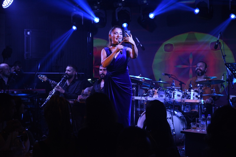 Sahnesinin ikinci bölümünü tempolu ve hareketli parçalara ayırarak ritmi yükselten güzel sanatçı, bir ara hayranlarından birinin telefonunu alarak sahnesinden canlı yayın yaptı. finali ise Müslüm Gürses klasikleri ile yaptı.