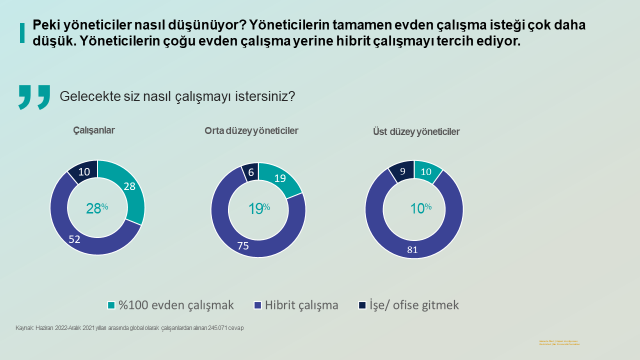 Resme diğer taraftan bakarsak hali hazırda ülkemizdeki uzaktan çalışanlar içinde on kişiden altısı ofis ile bir bağlantılarının olmasını istiyor. %13 tamamen ofise dönmek isterken, %45 hibrit bir çalışma biçimini yani biraz işyerinde biraz uzaktan çalışmayı tercih ediyor.