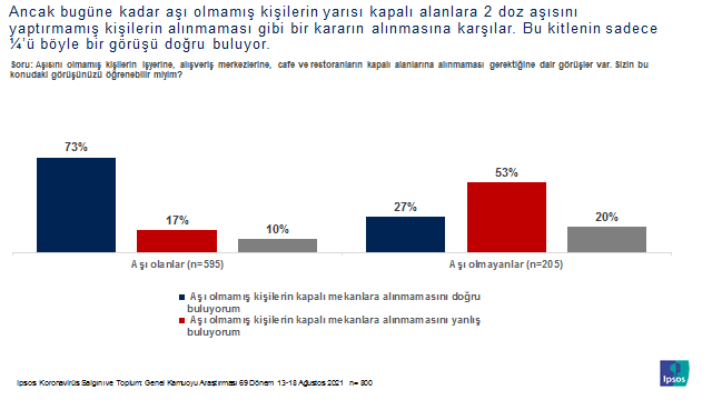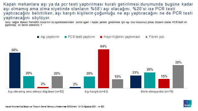 Ipsos tarafından gerçekleştirilen Koronavirüs Salgını ve Toplum Araştırması 69. dönem verileriyle vatandaşların; alışveriş merkezi, cafe ve restoran gibi kapalı alanlara aşı olmamış kişilerin alınıp /alınmaması, 2 doz aşısını yaptırmamış kişilerin alınmaması gibi bir kararın alınması, için aşı olunması ya da düzenli olarak pcr testi yaptırılması kuralının getirilmesi, pcr testi zorunluluğunun getirilmesi kararını, bugüne kadar aşı olmamış ama olma niyetinde olanları, Çocuğu okula gidecek olan ebeveynlerin aşı olması veya olmayanların ise düzenli olarak pcr testi yaptırma zorunluluğunun getirilmesi gibi konularda ifade, tutum ve davranışları incelenmiştir.