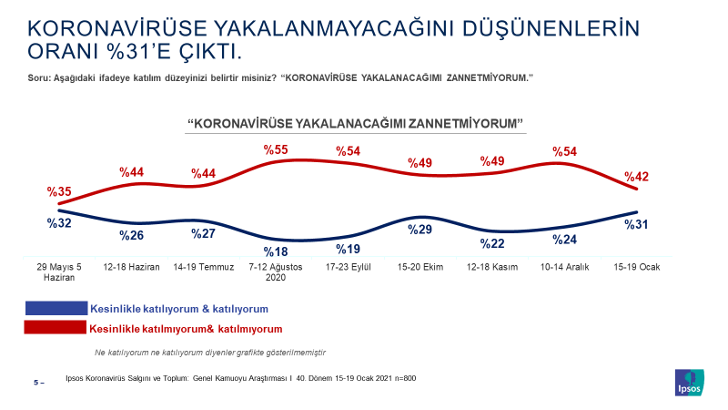 Ipsos; vatandaşların virüse yakalanma olasılıklarına ilişkin algılarını Koronavirüs Salgını ve Toplum Araştırması ile uzun bir süredir takip ediyor. Ülkemizde vaka sayılarının 2.5 milyona yaklaştığı bir dönemde vatandaşların halen virüse yakalanmayacaklarını düşünmeleri dikkat çekici bir konu olarak değerlendiriliyor. Haziran başından bu yana sorulan bu soruda virüse yakalanacağını zannetmeyenlerin oranı ortalama %25 olarak gerçekleşti. Son haftada bu oran %31 seviyesine kadar yükseldi, diğer bir ifadeyle toplumun yaklaşık üçte biri kendini salgın çemberinin dışında görüyor. Veriyi değerlendiren Ipsos uzmanları bu durumun sadece aşının uygulanmaya başlanmasıyla açıklanamayacağını, çünkü aşı kullanıma hazır olmadan önce de benzer bir algıya tanıklık edildiğini belirtiyor.