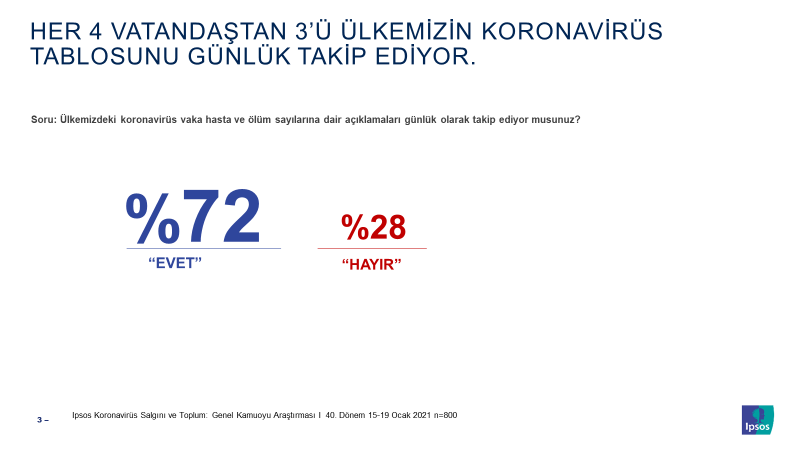 Ipsos’un Koronavirüs Salgını ve Toplum Araştırmasının 40.dönem verileriyle; vatandaşların virüs ile ilgili açıklanan günlük veri tablolarına olan ilgi ve takipleri, bireylerin virüse yakalanıp/ yakalanmayacağına dair düşünceleri, maske kullanmaya dair tutum ve davranışları beraberinde salgınla mücadele sürecinin ülkemizdeki gidişatına yönelik değerlendirmeler ele alındı.