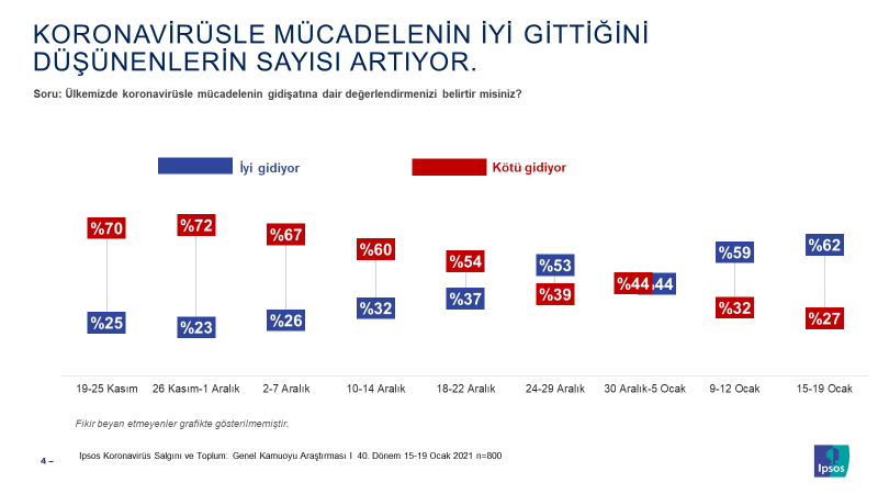 Ipsos, Koronavirüs Salgını ve Toplum Araştırması ile vatandaşların koronavirüsle mücadeleye dair değerlendirmelerini almaya devam ediyor. 2020 Kasım ayında bu konuda olumsuz değerlendirme yapanlar daha ağırlıktaydı. Toplumun %72’si mücadelenin kötü gittiği kanaatine sahipti, sadece %23’ü iyi gittiğini düşünüyordu. Vaka sayılarındaki azalma ve aşı uygulamasının başlamasıyla beraber olumlu değerlendirmelerde süreçte ciddi bir artış yaşandı ve tablo tersine döndü. 15-19 Ocak 2021 döneminde bu konuda bireylerin %62’si olumlu, %27’si ise olumsuz değerlendirme yaptı.