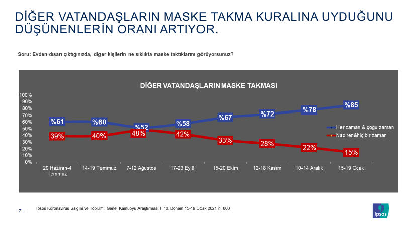Bireyler, genel olarak kendilerinin aldığı bireysel tedbirleri yeterli, başkalarının aldığı tedbirleri ise yetersiz görme eğilimi içinde olmuştu. Temmuz ayı başından bu yana bireylere diğer vatandaşları ne sıklıkla maske kullanırken görüyorsunuz sorusu yöneltildi. Yaz ortasında toplumun yarısı diğer vatandaşları nadiren maske takarken gördüklerini ifade ediyordu. Bu oran zaman içinde azaldı ve Ocak ortasına gelindiğinde %15’e kadar indi. İlk kez vatandaşlar, diğer vatandaşların maske kullanımlarına bu kadar iyi not veriyor (%85).