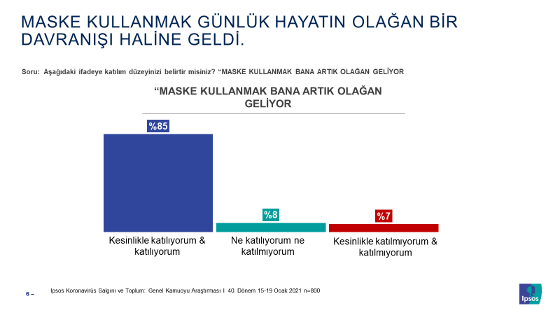 Eylül ayında kamuya açık alanların tamamında istisnasız bir şekilde maske takma zorunluluğu getirilmişti. Maske takma zorunluluğu toplumun çok büyük kesiminin desteklediği bir kamusal önlem olarak Ipsos’un araştırmalarında öne çıktı. Buna ilaveten, günlük yaşam pratiğinin de olağan bir parçası haline gelmiş durumda… Vatandaşların %85’i maske kullanmayı artık olağan gördüklerini ifade ediyor. Bu görüşe karşı çıkanlar sadece %7 seviyesinde.