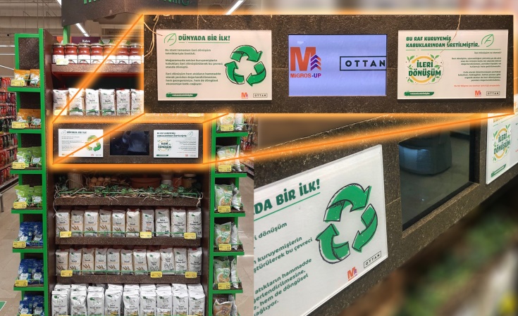 Migros Up ve OTTAN Studio iş birliğinde, mağazada satılan ceviz ve fındıkların kabuklarından ileri dönüşüm tekniğiyle üretilen raflar, Migros’un MLife markalı ürünlerinin reyonlarında kullanıldı.