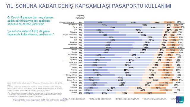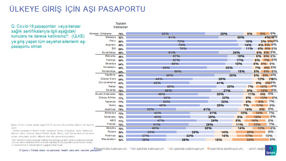 Araştırmada sorulan bir başka soruda; aşı pasaportlarının yapılan seyahatlerin yanı sıra, büyük etkinlikleri güvenli hale getireceğine dair etkisi incelendiğinde, “aşı pasaportları etkili olacaktır” diyen küresel çoğunluğun oranı %73… Çin %84, Arjantin %84, Malezya %82, Hindistan %82, Türkiye %77, İtalya %76 Ispanya %75, Almanya %67, Fransa %65, Rusya %53, Macaristan %52..