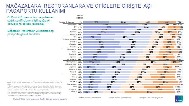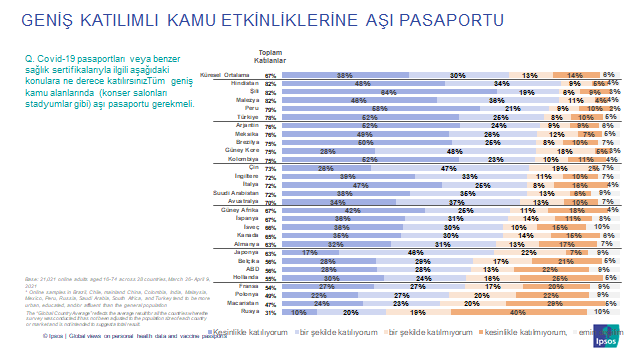 Dünya Ekonomik Forumu için Ipsos tarafından gerçekleştirilen araştırma; Türkiye dahil 28 ülkeyi kapsamaktadır. Verilere göre ortalama olarak her dört bireyden üçü ülkelerine giriş için Covid-19 aşı pasaportunun gerektiğini düşünüyor ve bunun seyahat ve büyük etkinlikleri daha güvenli hale getireceğine inanıyor. Her üç kişiden yaklaşık ikisi de geniş kamu alanlarına girişte de bunun gerekli tutulması yönünde görüş belirtiyor ve aynı oranda bir kitle bu uygulamanın ülkelerinde geniş kapsamda yer bulmasını bekliyor. Öte yandan, küresel kamuoyunun sadece yarısı mağazalar, restoranlar ve ofislerde bunun gerekli tutulmasını belirtiyor.